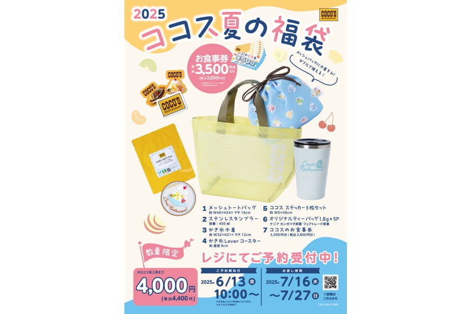 ココス「夏の福袋」発売! メッシュバッグ/タンブラー/巾着/3500円分の食事券などがセットで4400円