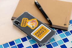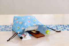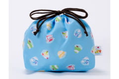 涼しげなアイスブルーの生地に「純氷ふわふわかき氷」のイラストを散りばめた巾着袋。ネームタグにあしらった「純氷ふわふわかき氷 しろくま」のイラストやココスのロゴカラーを合わせた茶色の紐がデザインのポイントになっている。
