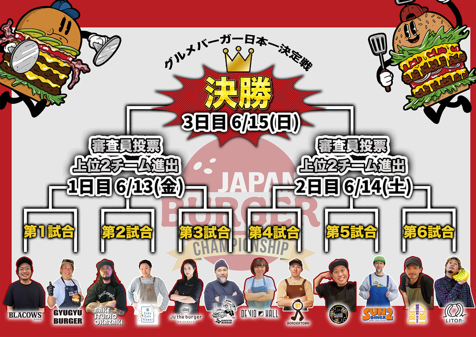 会場では、本場アメリカで行なわれる世界大会の出場権をかけて全国72チームの応募を勝ち抜いた12チームが競う。制限時間60分以内にテーマに沿ったハンバーガーを完成させ、味・見た目・調理の正確さで競って日本一を決定する。トーナメント形式で、決勝は最終日となる6月15日に行なわれる。