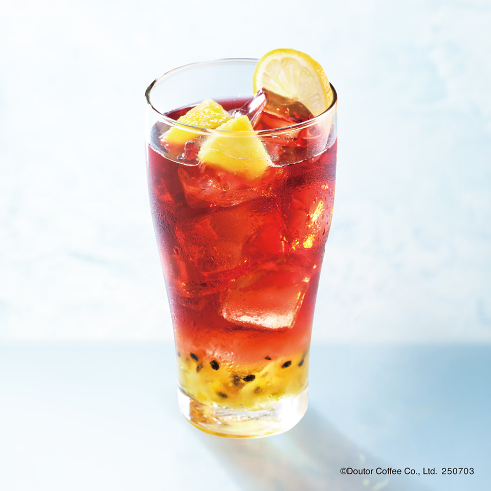 鮮やかなルビーレッドの美しい色合いと爽やかな酸味が魅力のローズヒップ&ハイビスカスティーに、ナタデココとパッションフルーツの種も入ったソースを合わせたトロピカルフルーツティー。仕上げにトッピングしたパイナップルのジューシーな甘みがアクセントで、夏にぴったりのノンカフェインドリンクになっている。