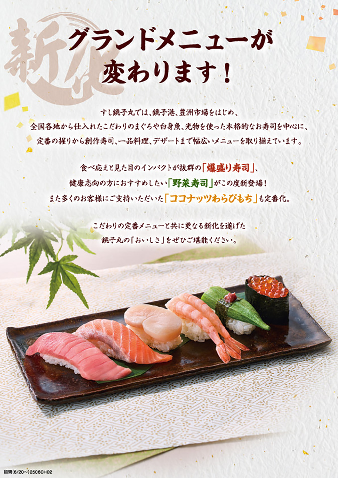 すし銚子丸、グランドメニューをリニューアル。「爆盛り寿司」「野菜寿司」「ココナッツわらびもち」など追加