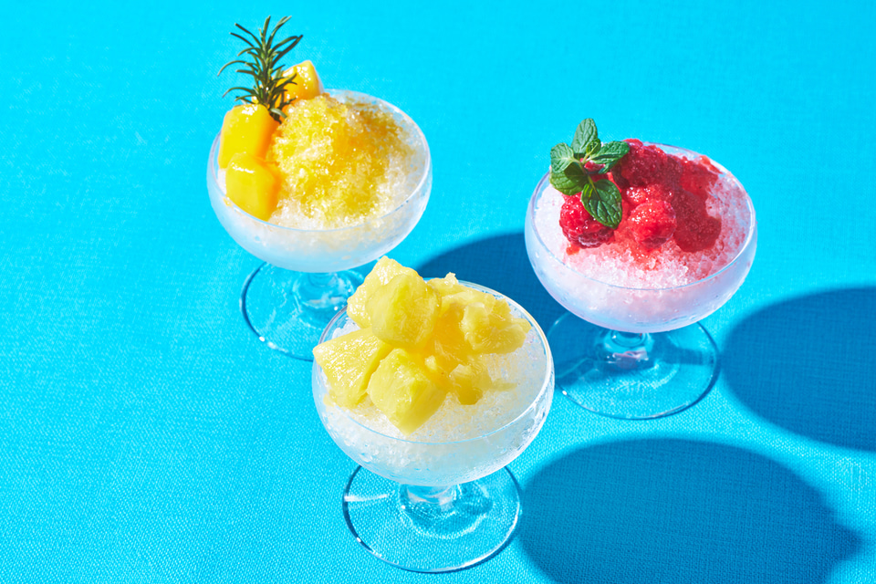 氷の上に旬のフルーツとシロップをたっぷりトッピングし、仕上げに泡盛をかけた「NEO AWAMORIフラッペ」。フレーバーはパイナップル、マンゴー、ベリーの3種類から選べる。泡盛と旬のフルーツで楽しむ大人のフラッペ。
