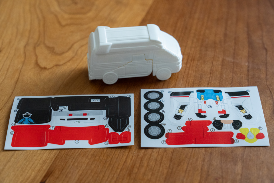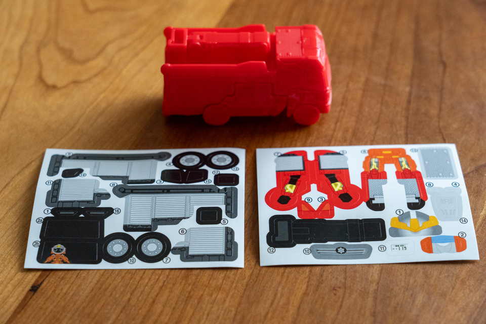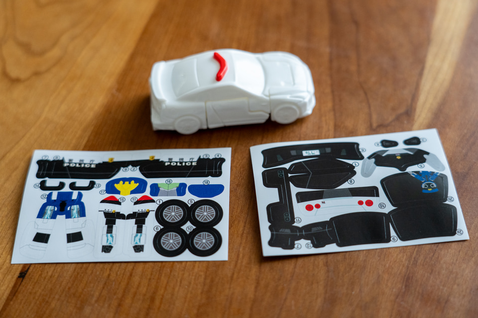 ちなみに、今回のおもちゃに付属するシールは細かい上に数も多い。なぜなら乗り物部分とロボット部分の両方があるからだ。それゆえ、キレイに丁寧に貼れると達成感が味わえるはず! 頑張って!