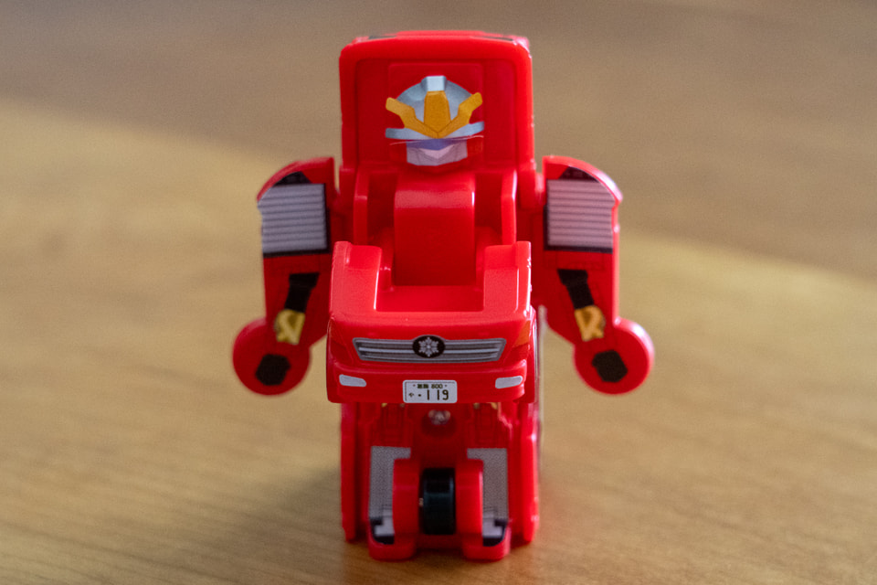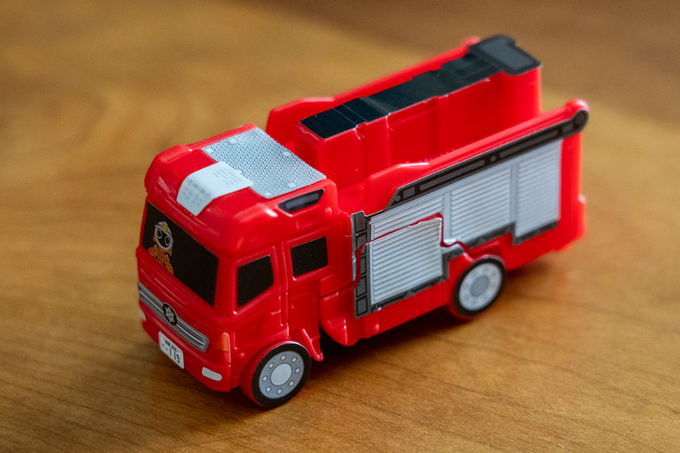 火災現場活躍するファイヤブレイバーは、「モリタ多目的消防ポンプ自動車MVF」から変形する。パワーや装備に優れたジョブレイバーだ。