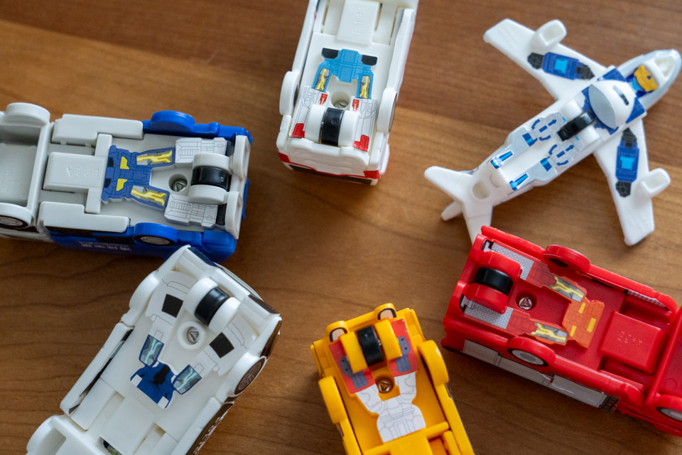 飛行機や救急車などをロボットに変形して遊ぶのはもちろん、ローラーが付いているので手で転がして走らせることもできる。