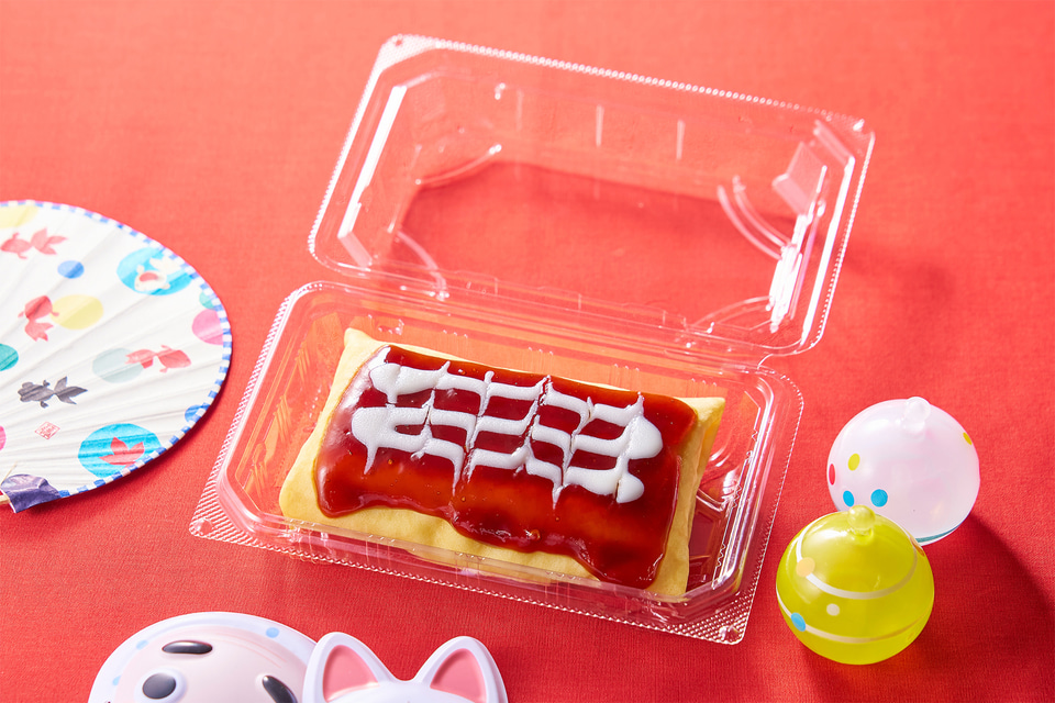 お好み焼きの生地の部分をクレープの生地で表現し、お好み焼きソースはカラメルソース、マヨネーズはホワイトチョコソースで見た目を再現した。クレープの中にはやさしい甘みのバニラクリームとしっとりしたスポンジが入っている。