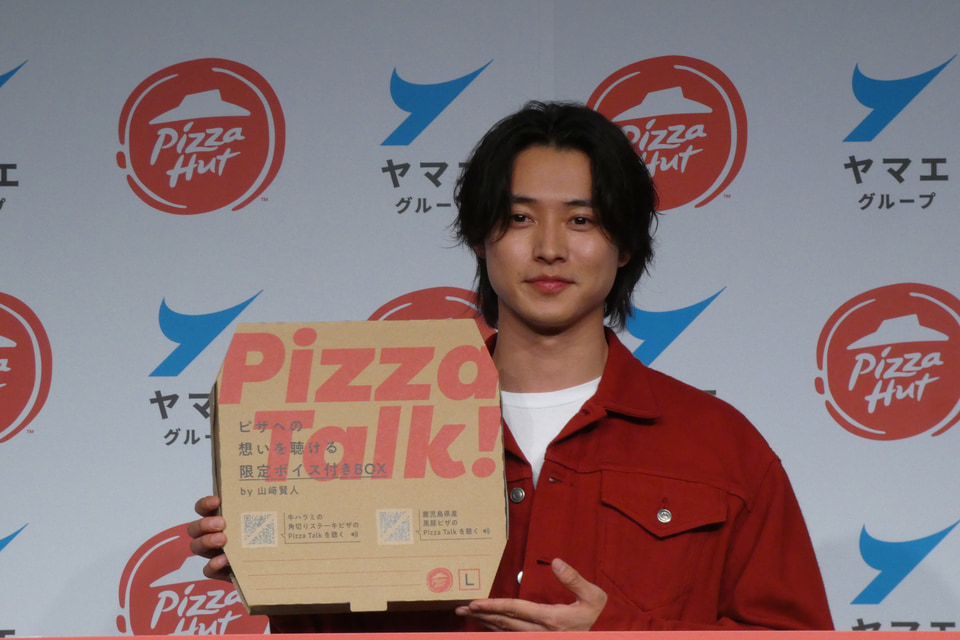 発表会にはテレビCMや音声コンテンツに登場する山﨑賢人も登場。青森県産にんにく香る 牛ハラミの角切りステーキピザについて「ハラミとにんにくがあわさった最強のおいしさ。匂いがおいしい」、炭火香ばしい 鹿児島県産黒豚ピザについては「炭火なので炭の香りがスーッと入ってきて、黒豚のジューシーさもあり、すごくおいしい」と両商品をアピールしていた。