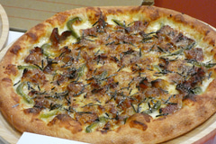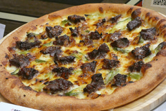青森県産にんにく香る 牛ハラミの角切りステーキピザは、約2.5cm角の牛ハラミと青森県産のにんにくをメインに使用した商品。香ばしいにんにくの香りが牛肉本来の旨みを引き立てる。梨果汁を使用した特製の焼肉ダレのフルーティーな味わいとともに楽しめる。