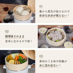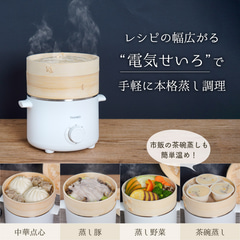 せいろにより食材のうま味や栄養を逃さずふっくらと調理できるほか、出来上がり後はせいろをそのまま食卓に出して楽しむことができる。サイズは24.5×21×15cm(幅×奥行き×高さ)で、せいろの直径は18cm。設定できる調理時間は最大60分で、最大水容量は1.4L。
