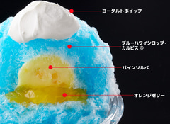 まんまる姿に青い帽子がトレードマークのオラフを、ブルーハワイシロップとカルピスを使ったかき氷で表現した。中にはオレンジゼリーとパインソルベが入っており、トッピングにはヨーグルトホイップを添えた。