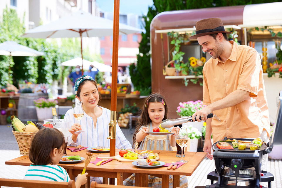 会場には購入した野菜をその場で焼いて味わえる、バーベキューエリアも用意されている。トングとカトラリーが付いている「グリル台セット」をレンタルし、キッチンカーで販売されているカットした10種類の「野菜セット」を用意すれば手軽にバーベキューが楽しめる。ピーマン通りの店舗で買ったソーセージやベーコンを一緒に焼いて味わうのもお勧めとのこと。