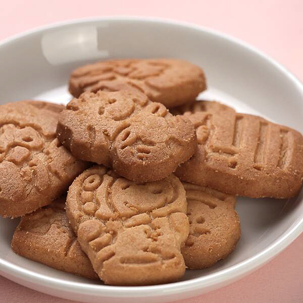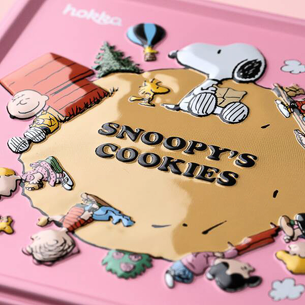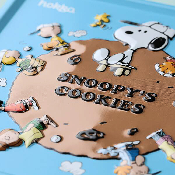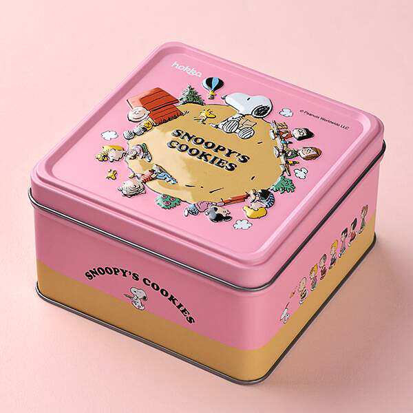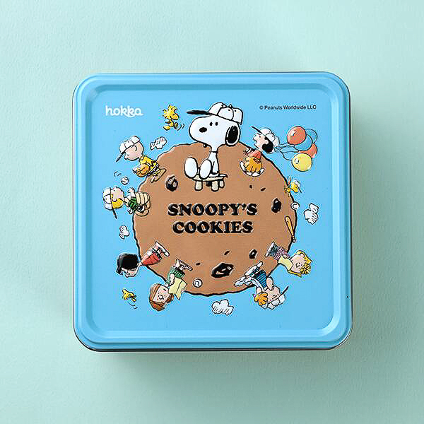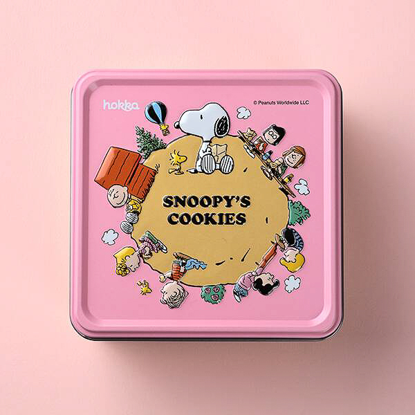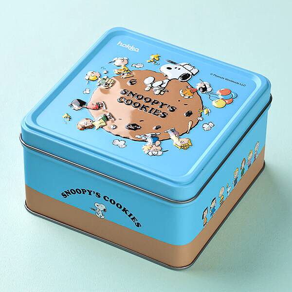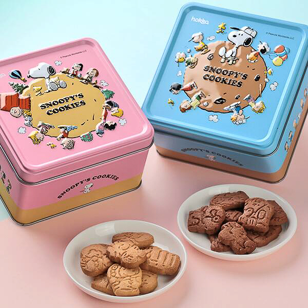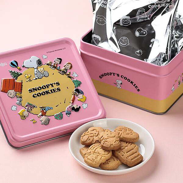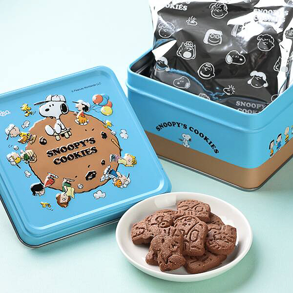 スヌーピーなどPEANUTSの仲間たちをデザインしたエンボス加工の缶に、スヌーピーたちの形をしたクッキー(17種からいずれか35g×2袋)が入って価格は1339円。メープルクッキーが入ったピンクの缶と、チョコチップ入りのココアクッキーのブルーの缶の2種類を用意している。
