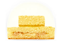 しろたんをイメージした真っ白なミルキーチーズクリームに甘酸っぱいレモンソースを入れた。スポンジでサンドしたサクサクのフィアンティーヌが食感のアクセントになっている。