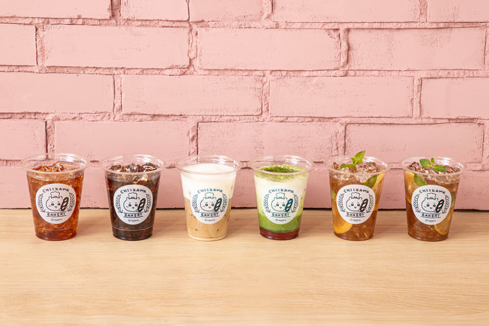 「ちいかわベーカリー」のロゴマークが入ったオリジナルのテイクアウトカップで提供されるアイスドリンクは全6種。