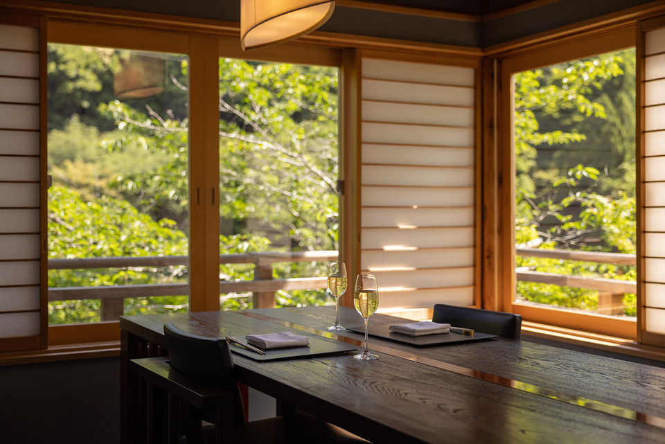 眼前を流れる大堰川と嵐峡の四季を感じられる客室は全室リバービュー。ダイニングで提供している「真味自在」は、京都で育まれた伝統的な日本料理の本質や精神を大切にしながらも、フランス料理や中華料理などの世界の技法や食材を取り入れ、主素材を最大限に引き立たせたもの。王道でありながら、新たな食材の取り合わせや遊び心を加えている。