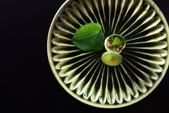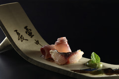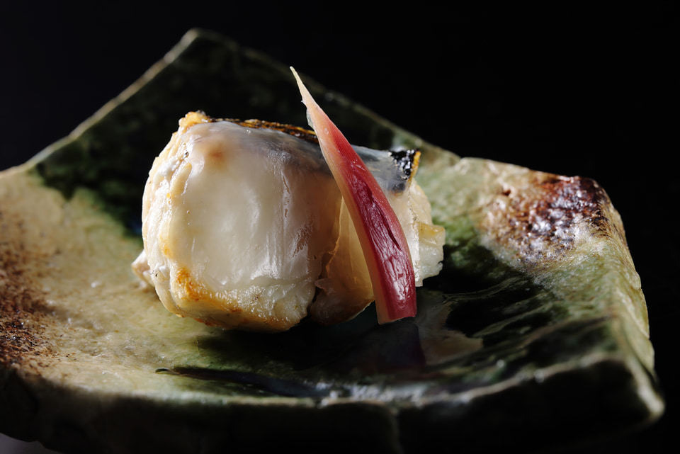 夏に旬を迎える鱸(スズキ)に塩を打ち、背脂の生ハム・ラルドを合わせたもの。ラルドは、パンやスープ、パスタなどに使われることが多い、イタリアの伝統食材。伝統的な日本料理である鱸の油焼(材料に油を塗りつけながら焼く方法)から着想を得ている。