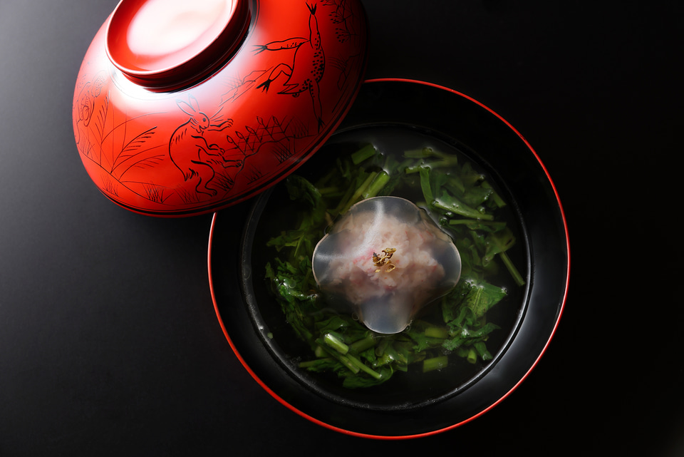 紹興酒と日本酒に漬けこんだ旬の毛蟹を蒸しあげ、ほぐし身を真丈(しんじょ)に仕立てた。中華料理から着想を得て、食感のよい空心菜を合わせたほか、弾力のある板蕨と柑橘を思わせるさわやかな香りが特徴のネパール山椒を加えることで、より蟹の甘みを引き立たせている。
