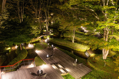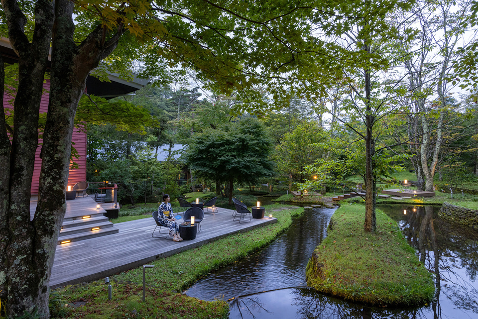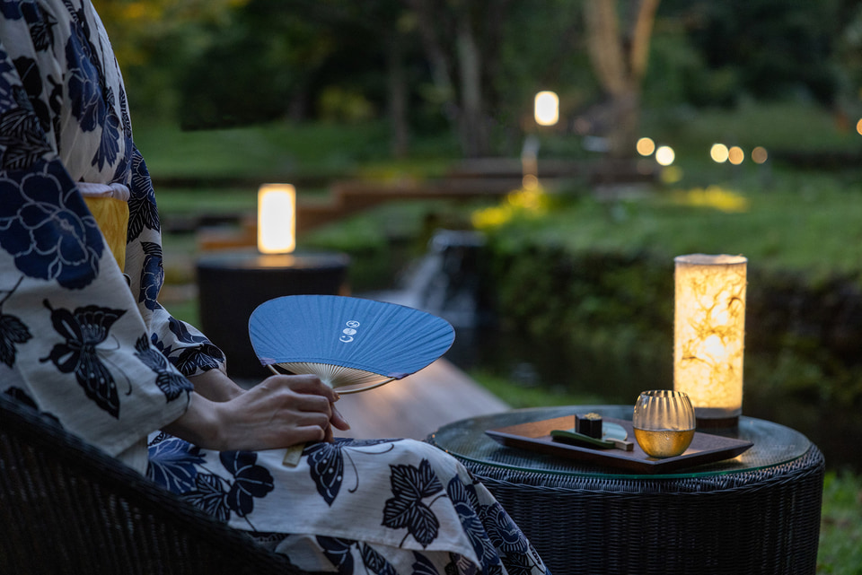 星のや軽井沢の象徴的なランドスケープである棚田のすぐそばに設えたのが「棚田Barラウンジ」。全28席の特等席では、棚田の景色を異なる角度から臨むことができる。ライトアップされた幻想的な空間で、棚田を流れる水の音、虫の音、風の音など、自然の音を感じながら、日常を忘れてゆったりと過ごせる。