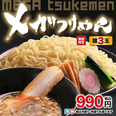メガつけめんは、麺の量と特製つけダレを通常の2倍(麺3玉)にしたつけめん。麺は冷盛りと熱盛りから選べ、価格は990円。