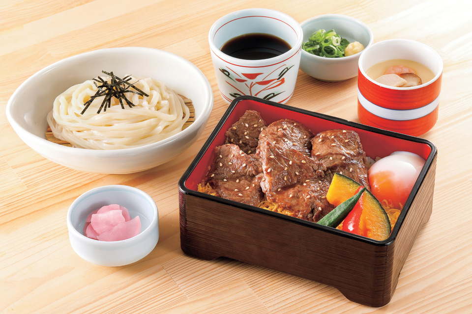 黒毛和牛の柔らかな食感と、ほのかな果実感と酸味のすき焼きの割り下で、深みのある味わいを楽しめるすき焼き重、黒毛和牛の「前バラ」を使った牛すきうどん鍋定食、厚切り牛タン3枚と牛タンとろろ丼を楽しめる牛タン御膳などを販売する。