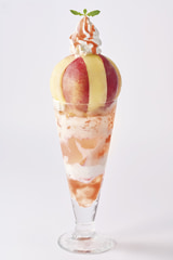 DXはフレッシュな国産の桃を丸ごと1個使用した迫力満点のパフェで、高さは30cmを超えるビッグサイズで提供する。パフェの中身には、桃、白桃ソルベ、北海道ソフトクリーム、コーンフレーク、白桃ゼリー、ホイップ、白桃ソース、アロエを使用。