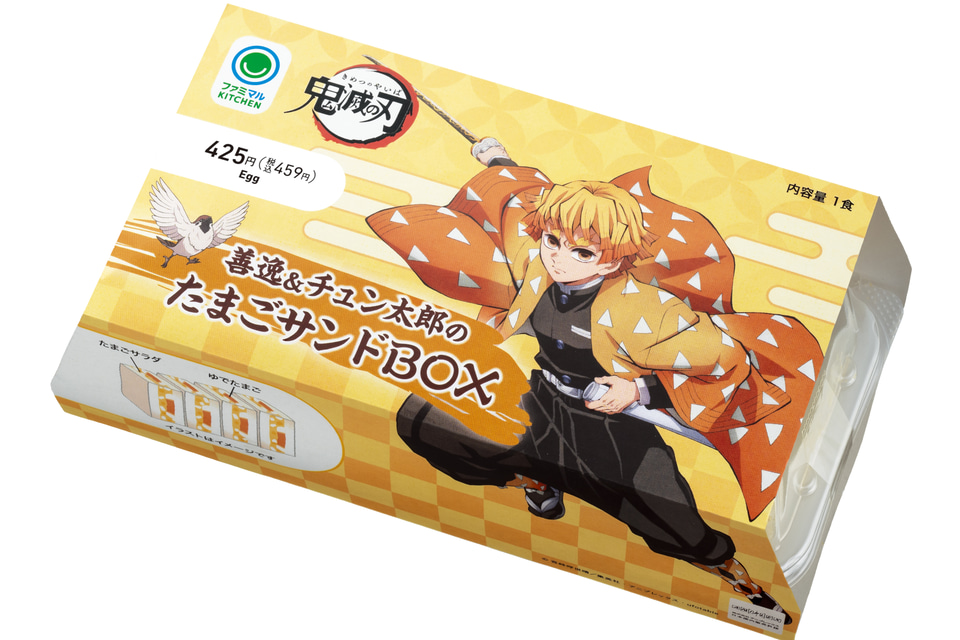 「善逸&チュン太郎のたまごサンドBOX」は、我妻善逸のキャラクターカラーをイメージしたたまごサンドのBOX。シンプルにゆでたまごとたまごサラダが組み合わせられている。価格は459円。