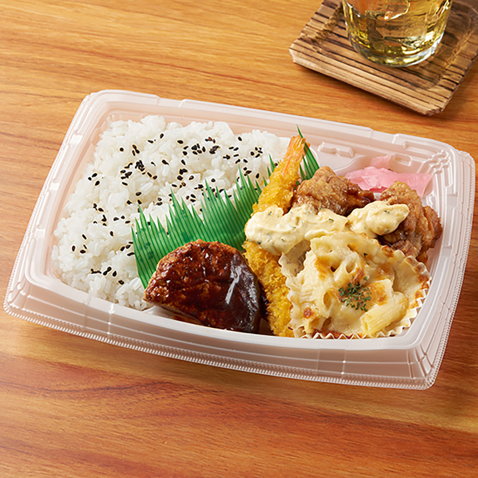 エビフライ、チキン南蛮、グラタン、ハンバーグなど、がんこ監修の洋食メニューを詰め合わせたお弁当。グラタンは豆乳を使用している。