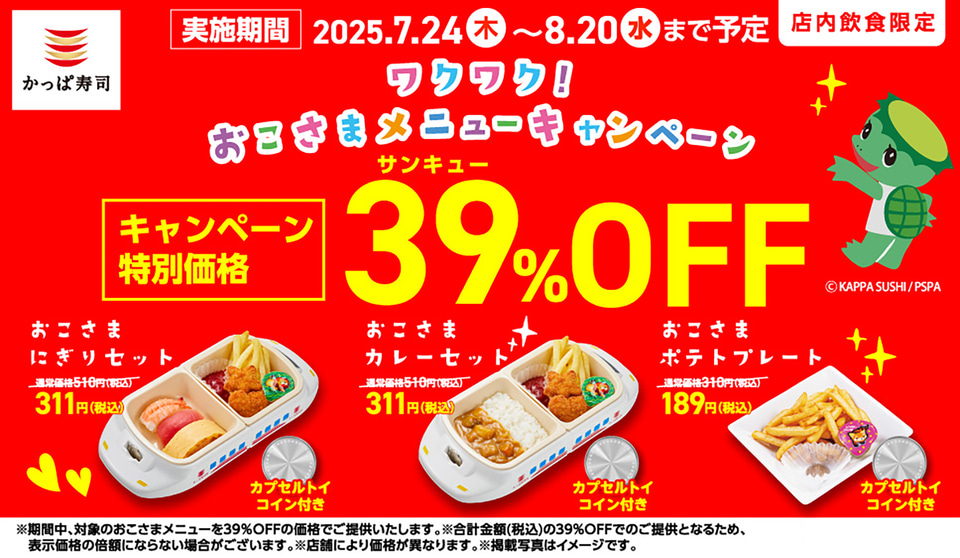 かっぱ寿司、おこさまメニューが期間限定39%オフ。カプセルトイコイン付き おこさまプレートが“189円”に!