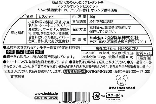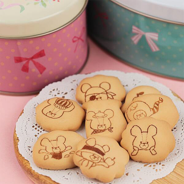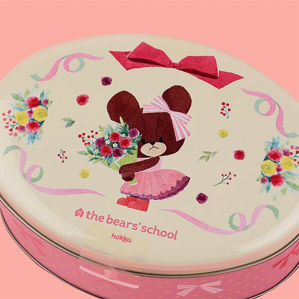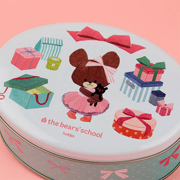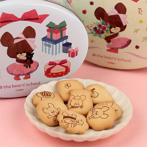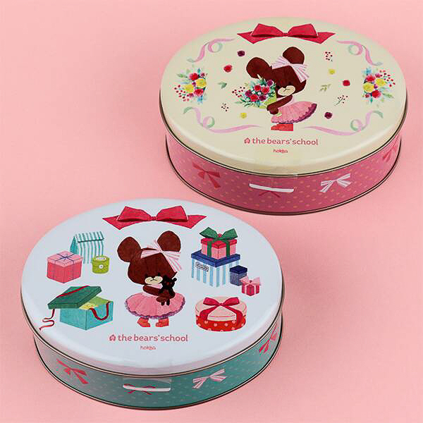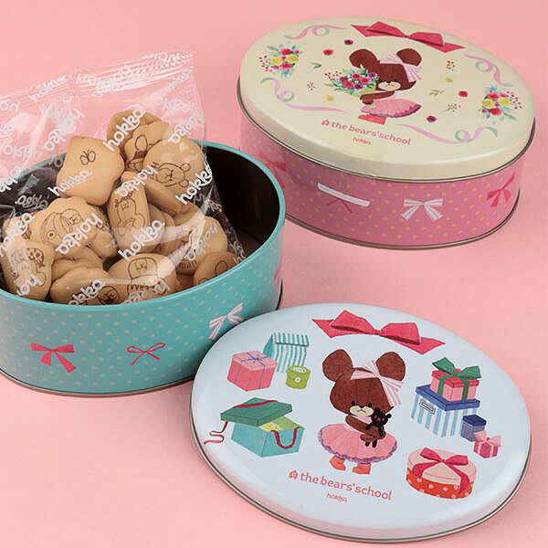 絵本「くまのがっこう」のキャラクターをデザインした缶(約140×100×55mm)にジャッキーをはじめ、くまのこたちがプリントされたアップルオレンジ味のビスケットが40g入って価格は1400円。デザインは2種類(ランダムで選択不可)。
