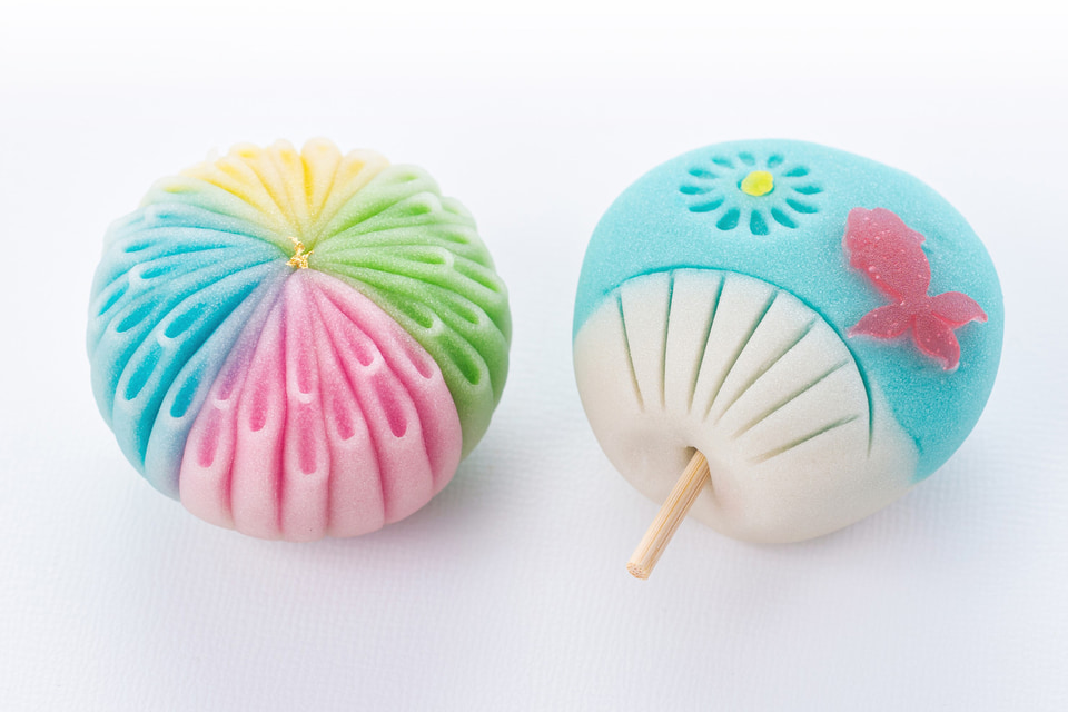 大阪初登場となる「花火」は、夏の夜空に咲く大輪の花火とうちわをモチーフに、練り切りで仕立てた上生菓子。鮮やかな色づかいと繊細な細工で、涼やかな一品に仕上げている。