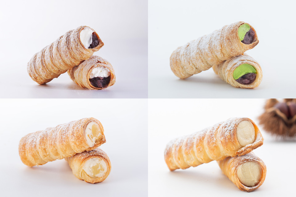 4種類のコルネを、期間ごとに種類を変えて販売する。「あずきコルネ 和三盆クリーム」は、北海道産小豆の粒餡と、和三盆仕立てのクリームを使っている。「あずきコルネ 抹茶クリーム」には、粒餡と抹茶クリームを使用。「レモンコルネ」は、白餡にレモンピール・ゼリーを合わせた特製クリームを入れている。「栗コルネ」は、栗ペーストと白餡を使ったマロンクリームを、香ばしいパイ生地に詰めた。