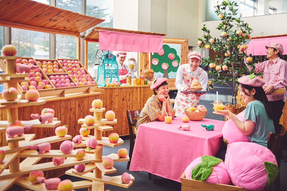 福島県は日本国内生産の約25%を占める全国有数の桃の産地であり、シーズン中は「はつひめ」「あかつき」「まどか」をはじめ、合計25種類以上が出回る。本イベントでは、夏の味覚である桃を堪能できるように、かき氷やクリームソーダなど果実をふんだんに使用した各種スイーツを用意した。また、会場も見て楽しめるように果樹園をイメージしたものになっている。