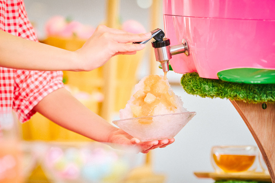 夏の定番スイーツ・かき氷と桃を楽しめる「もも氷」は、かき氷の上にかけるシロップとトッピングを、自分好みでアレンジできる。シロップは「さっぱり桃シロップ」「あまい桃シロップ」「すっぱい桃シロップ」の3種類から選び、トッピングは蜂蜜やジャムなどを好きに乗せることができる。