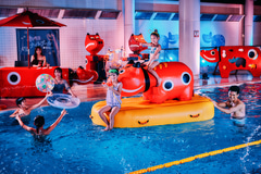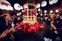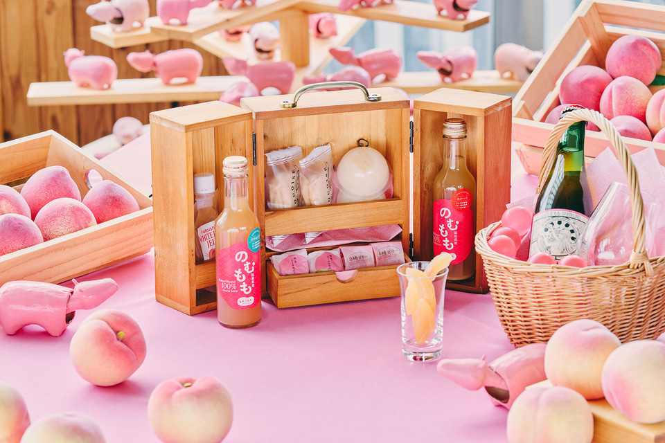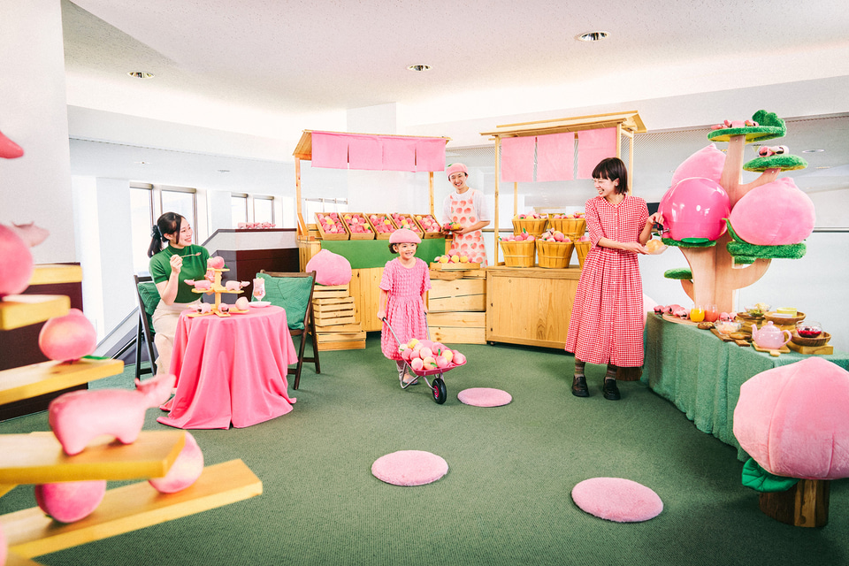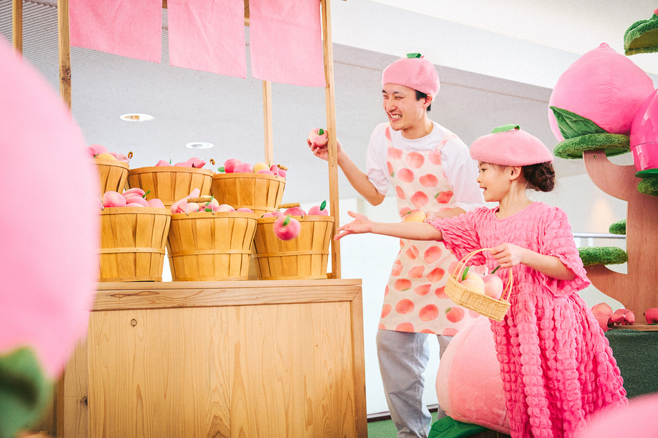 会場には桃の木のモチーフや収穫用の木箱などが置かれ、桃の果樹園をイメージした空間に仕上げた。大きな木箱に桃の実がいっぱいに入った「ももボールプール」では、まるで自分が収穫されたかのような写真撮影が可能。そのほか、桃を木箱に投げ入れると景品がもらえる「もも収穫ゲーム」など、縁日の屋台のような雰囲気が楽しめる。