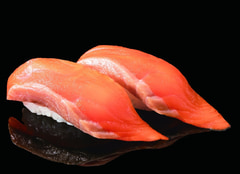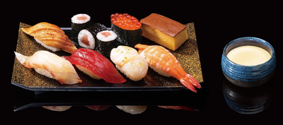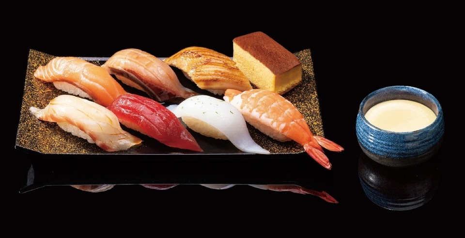 ノルウェー産アトランティックサーモンや日本初のオーガニック水産物“オーガニックはまち”などの7貫の寿司とカステラ玉子、特製茶碗蒸しがセットになった商品。