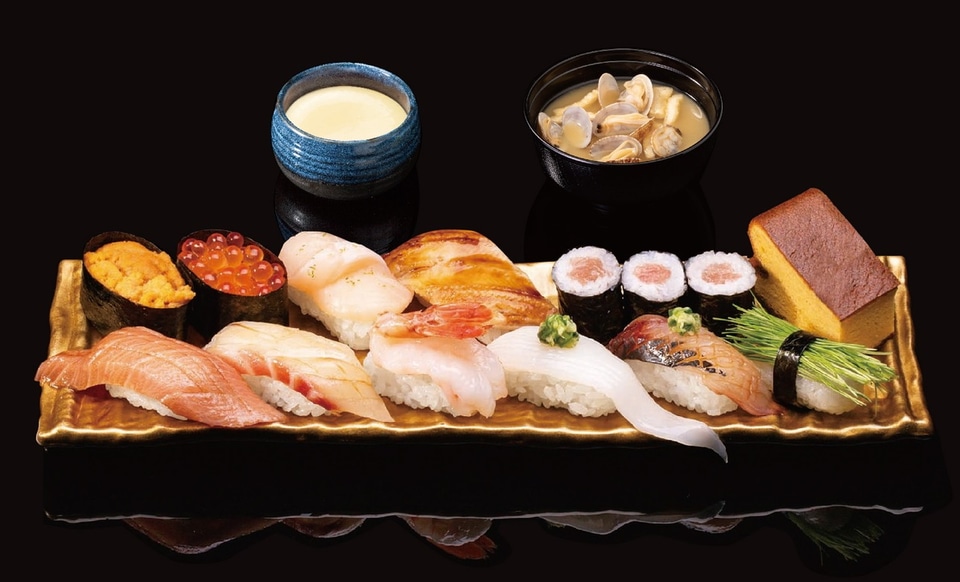 赤身の旨みと脂の甘みのバランスのよい「【地中海産】本まぐろ中とろ」や「うに軍艦」など11貫の寿司とカステラ玉子、特製茶碗蒸しのほか、毎朝店舗で出汁を取って作った本格的な味わいの「あさりの味噌汁」がセットになった商品。