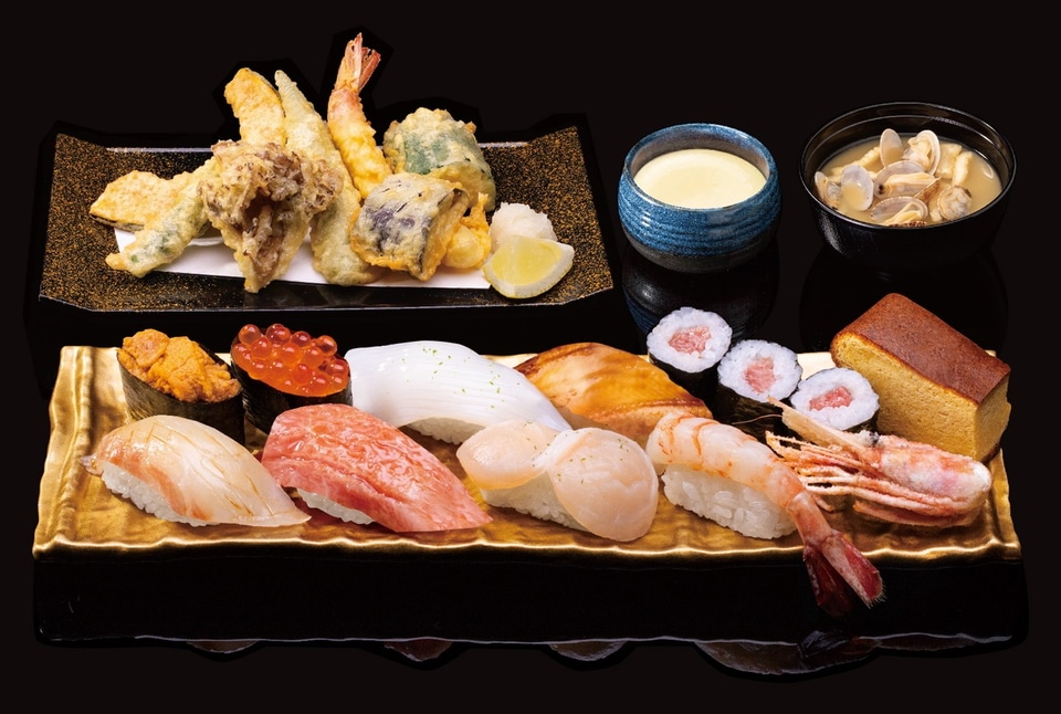 内容: 極 寿司セット(うに軍艦・大粒いくら軍艦・あおりいか・活〆穴子・とろ鉄火巻・カステラ玉子・真鯛・本まぐろ 大とろ・ほたて・極上 ぼたんえび 頭付き)、天ぷら盛り合わせ(えび・ししとう・まいたけ・かぼちゃ・なす・ズッキーニ・おくら)、特製茶碗蒸し、あさりの味噌汁