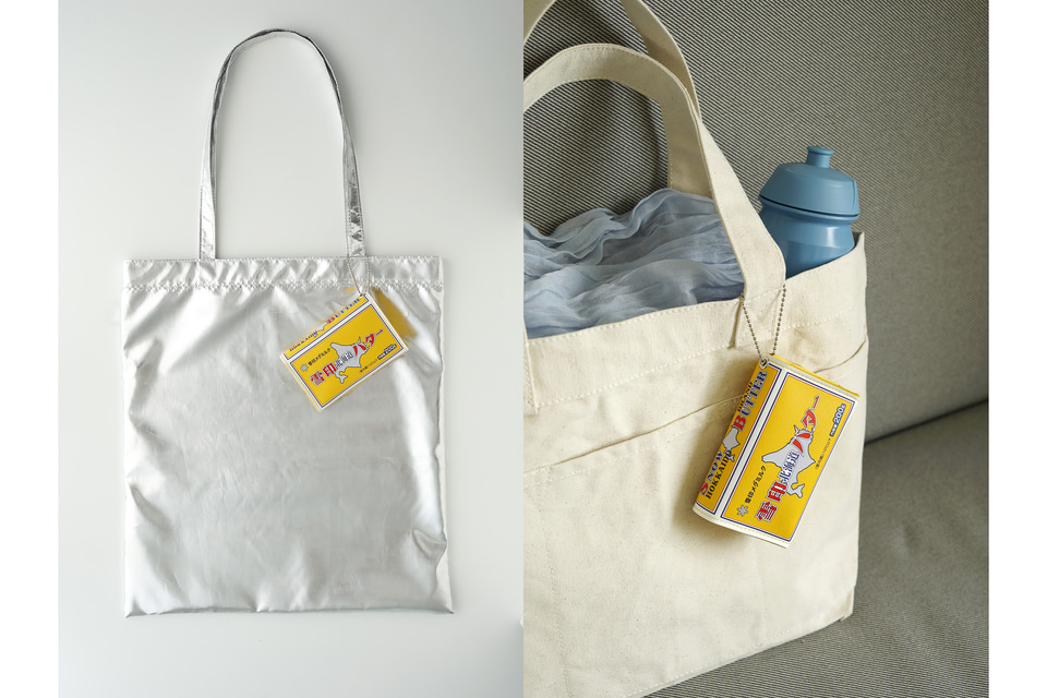 100年目を迎える「雪印北海道バター」にそっくりのポーチとエコバッグのセットで、ポーチのサイズは約12×2.5×6.5cm(幅×奥行き×高さ)、エコバッグのサイズは約36×40cm(幅×高さ)で持ち手の長さは約28cmとなっている。