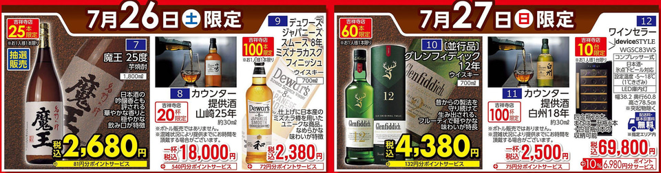オープン日にはセレモニーを開催するほか、7月24日~8月3日には各日で抽選販売・限定販売を実施する。希少な芋焼酎として知られる「森伊蔵」(1800mL)を3170円(7月24日限定)、「魔王 25度」(1800mL)を2680円(7月26日限定)で抽選販売するほか、角打ちコーナーではウイスキー「山崎25年」を20杯限定で1杯1万8000円(7月26日限定)、「白州18年」を100杯限定で1杯2500円(7月27日限定)で提供する。
