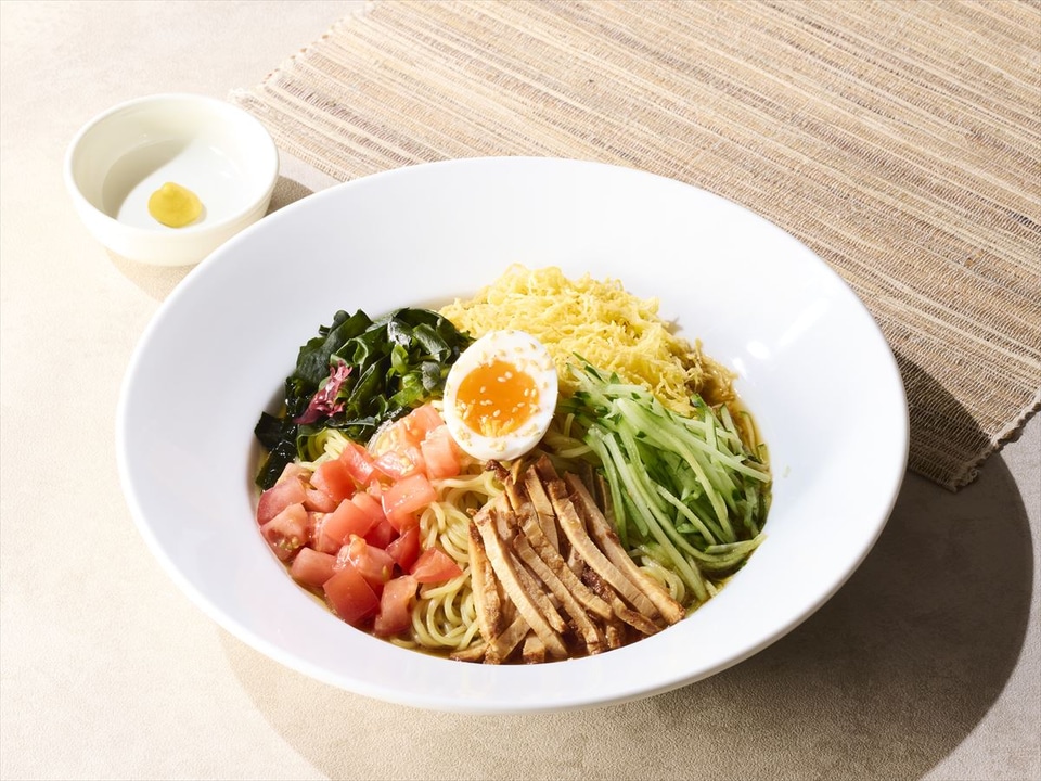 チャーシューや錦糸玉子、細切りキュウリ、ダイスカットしたトマト、海藻、ゆで玉子をトッピングした、甘酸っぱいタレの具沢山な冷やし中華。+440円で、まぐろたたき小丼またはサーモン小丼とのセットが選べる。