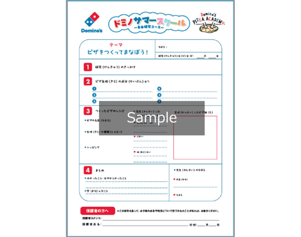 ピザ作りの体験ができる通常のピザアカデミーの内容に加え、「ドミノサマースクールクイズ」への挑戦のほか、本コース限定のワークシートのプレゼントもあり、小学生の夏の自由研究に適した内容となっている。