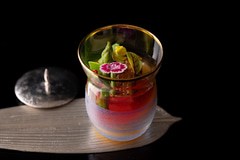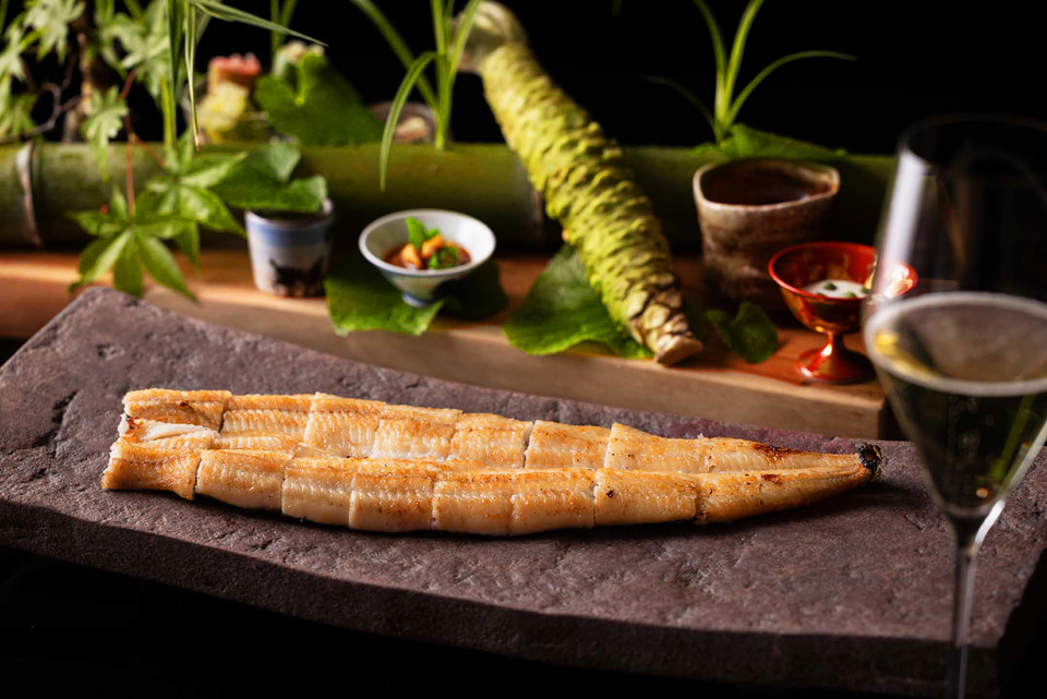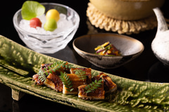 信州の鰻食文化と夏に旬を迎える山の幸を組み合わせた、鰻玉、鰻冊、白焼き、蒲焼きの4品を提供する。蒲焼きとなめらかな玉子豆腐にルバーブのジュレを合わせた鰻玉、そして胡瓜酢でさっぱりと仕立てた鰻冊は、夏の朝にふさわしいさわやかな一品に仕上げた。また、信州の食文化を織り込んだ七種の薬味で楽しむ白焼きは、鰻本来の旨味を堪能できるとのこと。最後は、香ばしく炭火で焼き上げた蒲焼きを提供し、夏に落ち気味な食欲を増進させる。締めには、信州の郷土料理「やたら」や、夏野菜氷に冷出汁をかけた茶漬けを楽しめる。