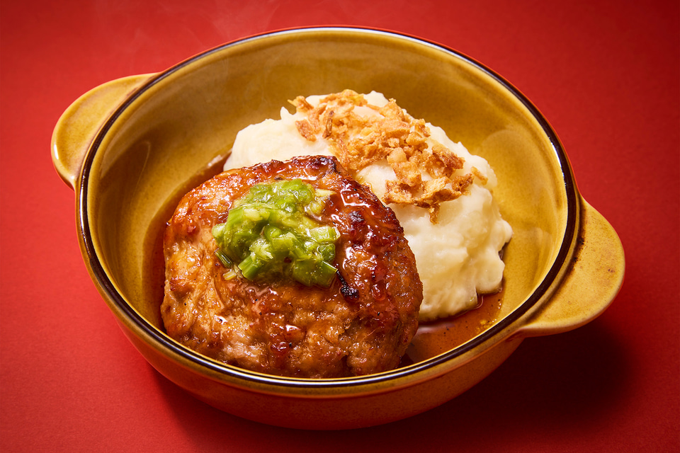 厳選した牛肉と豚肉に、食感と旨味を引き立てる隠し味として塩麹を使用した。付け合わせにポテトサラダは肉汁が染みこむ仕掛け。添えたきざみワサビがアクセントになっている。
