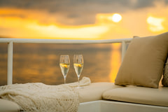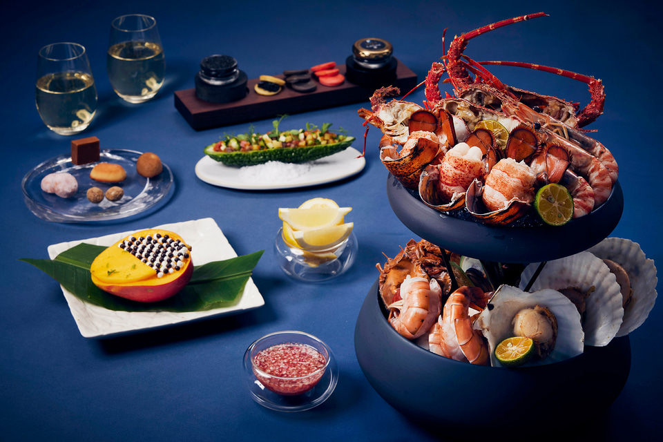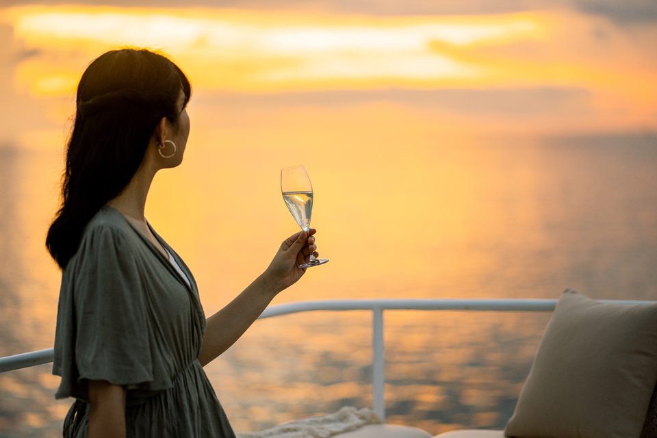 水平線に沈む夕陽を眺めながら楽しむアペリティフは、シャンパーニュとブリニが提供される。ブリニはヨーロッパで親しまれている料理で、そば粉や小麦粉などを使用した小さなパンケーキのこと。