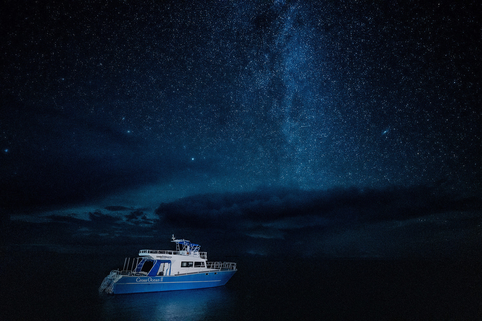 クルーザーを貸し切って夕暮れ時に出港する。ゆったりとくつろげるソファや、オープンエアのデッキを備えた船内では、特別なひとときを過ごせる。茜色に染まる空と海の絶景を眺め、日が落ちた後は周りを遮るものがない海上で、水平線まで広がる天の川を楽しめる。