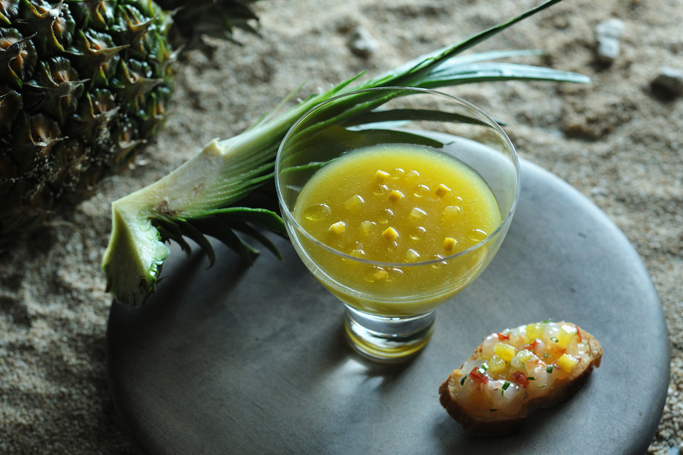 副題にファイバー(Fiber)をつけた冷前菜は、夏に旬を迎え甘みが増すパイナップルをガスパチョに仕立てたもの。パイナップルは食物繊維が豊富に含まれ、消化を助けるとともに、深い旨みが味わえる。