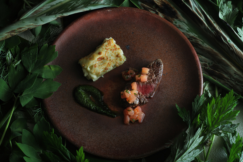 古くから食用や薬用として親しまれ、島人の健康長寿を支えてきた命草(ヌチグサ)を牛肉と味わう「Nuchigusa 牛フィレ肉 命草のグレモラータ」。牛フィレ肉は、月桃の葉に包んで焼き上げてさわやかな香りをまとわせており、フーチバー(ニシヨモギ)や長命草、イーチョーバー(フェンネル)など、命草と呼ばれる沖縄のハーブを使ったソースで仕上げた。