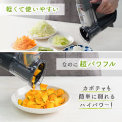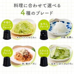 ハンディタイプの電動スライサーで、材料を入れてスイッチを押すだけで調理ができる。付属する4種のブレード(千切り・おろし・アイス・スライス)により、キャベツの千切りから大根おろしまで幅広く使用できる。氷やかぼちゃにも対応するパワフル設計。
