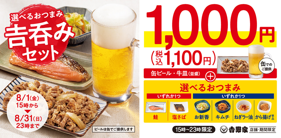 8月1日15時~31日23時には、缶ビールと牛皿、人気のおかずを組み合わせた「吉呑みセット」(1100円)を販売する。