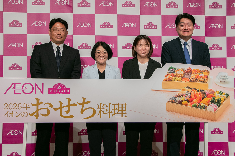 イオンは「2026年 おせち」の発表会を開催。イオン各社の担当者や監修を担当した有名店のシェフらが登壇し、商品の概要やこだわりを説明した。